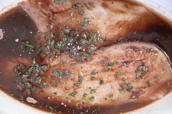En premier lieu, faites mariner les filets de turbot. Dans un plat allongé, déposez : de l’huile d’olive d’Espagne, 1 cuillérée d’aneth, 2 cuillérées de chocolat en poudre, du sel, du poivre, le jus d’un citron et son zeste coupé en petits morceaux.